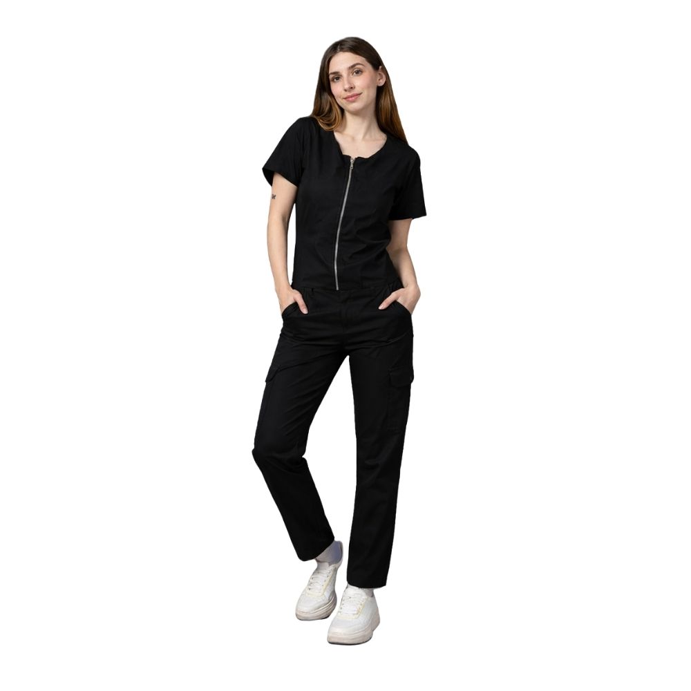 Filipina: corte siluetado con escote tipo U, cierre fontal, manga corta y 2 bolsas laterales